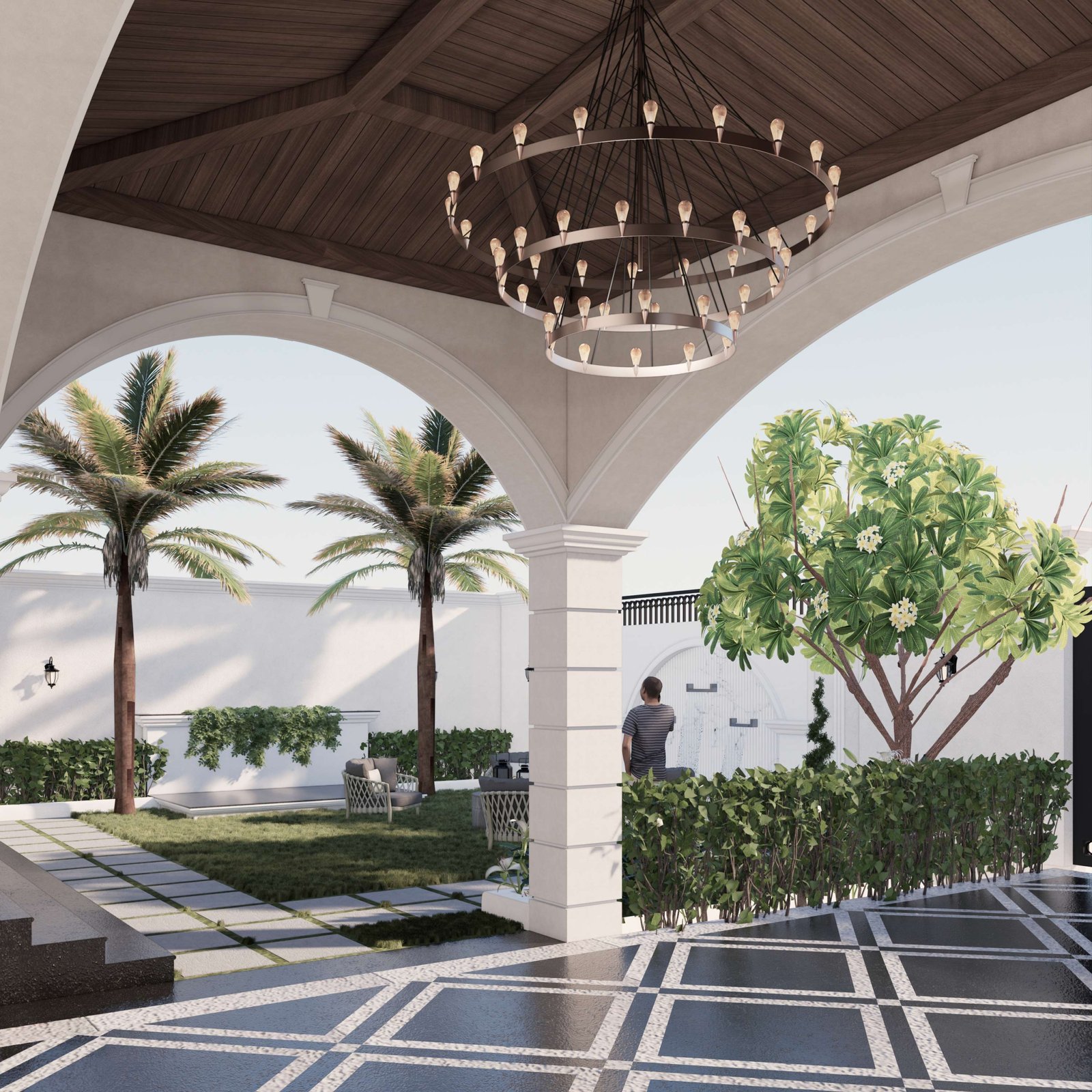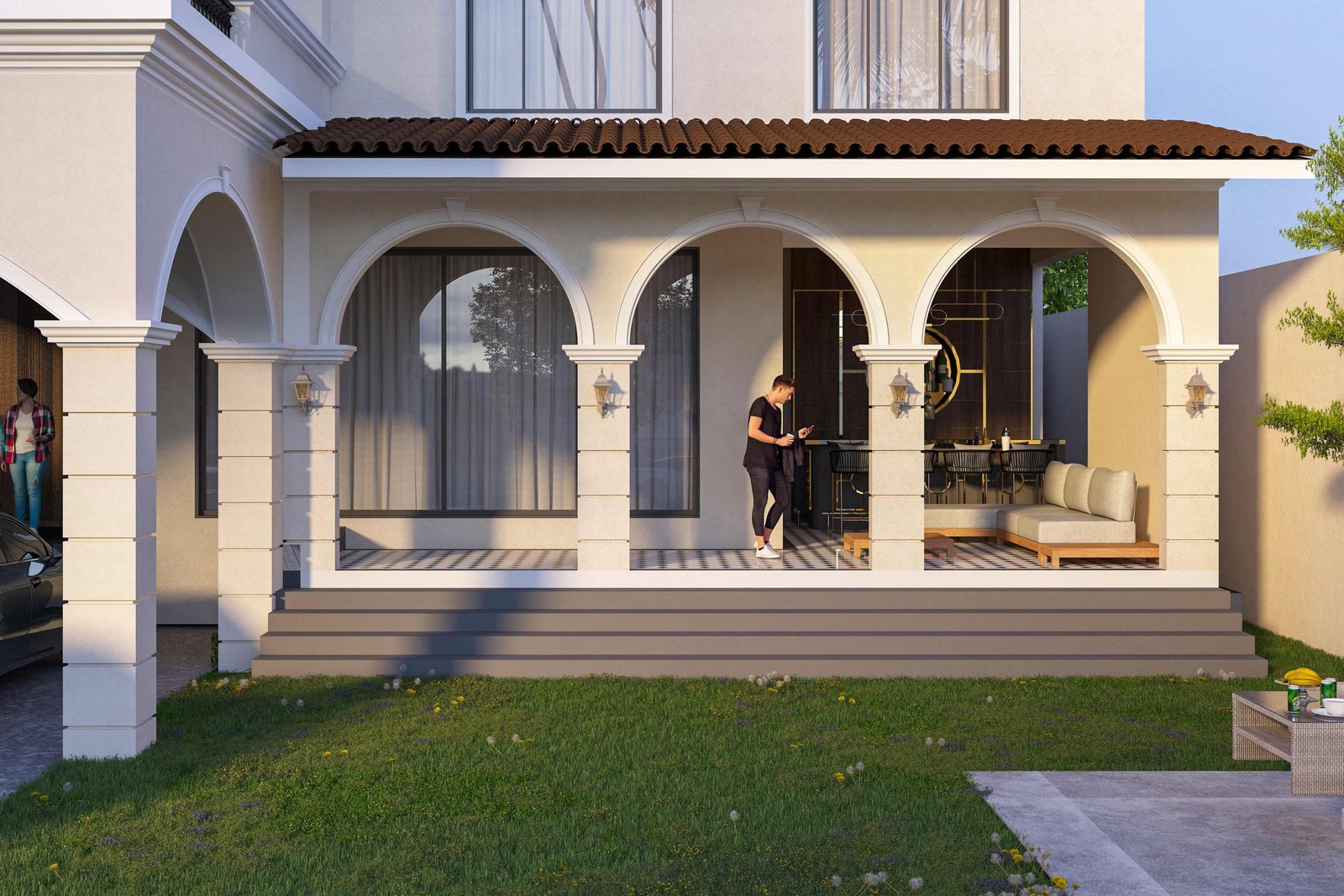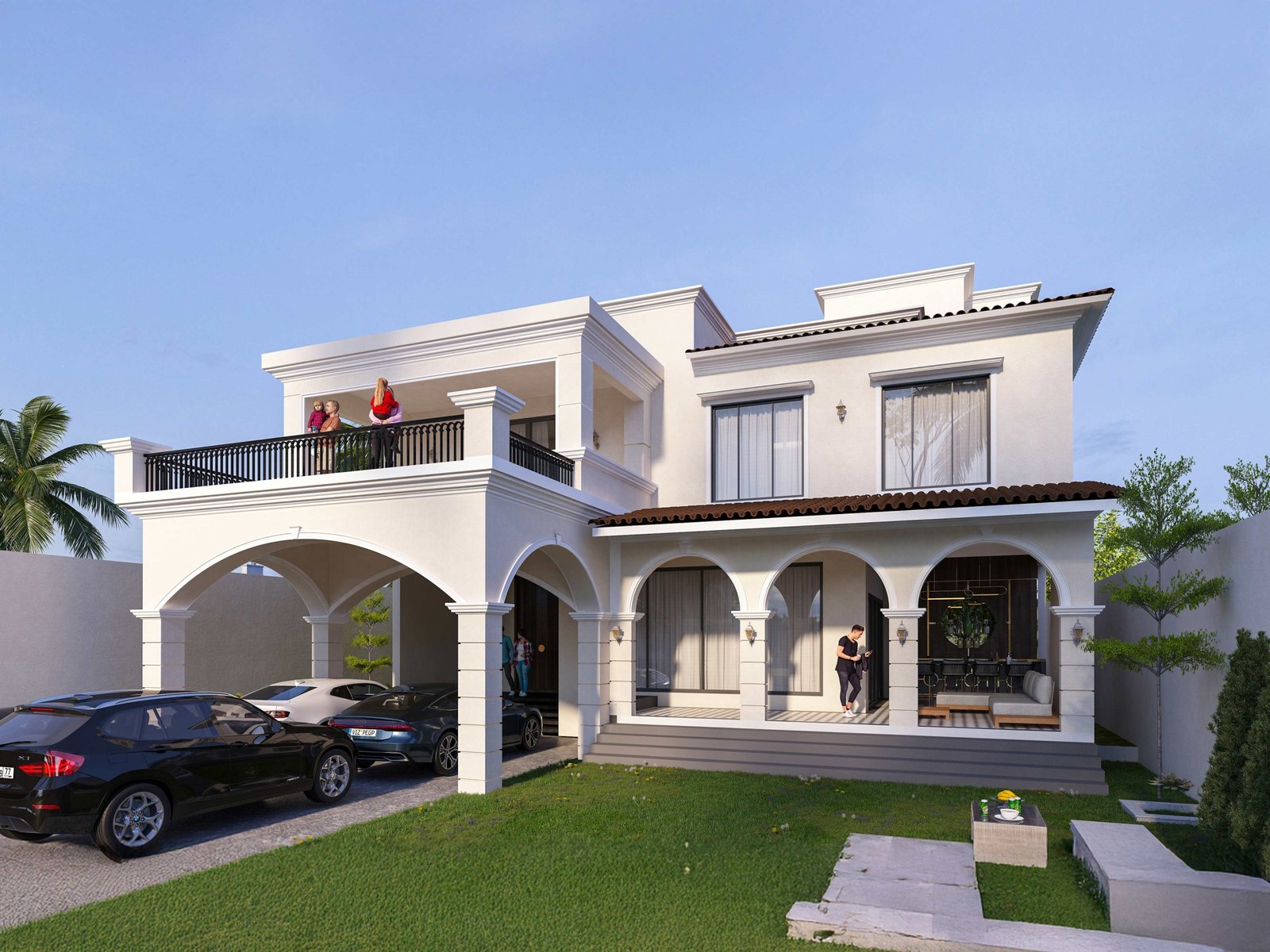 Generous colonnaded sit-outs and balconies form layered outdoor living spaces, allowing the residence to remain breathable and continuously connected to sea breezes, natural light, and the surrounding landscape. Soft, neutral façades provide a serene canvas, complemented by classic railings, arched openings, and textured finishes that add depth and understated elegance.