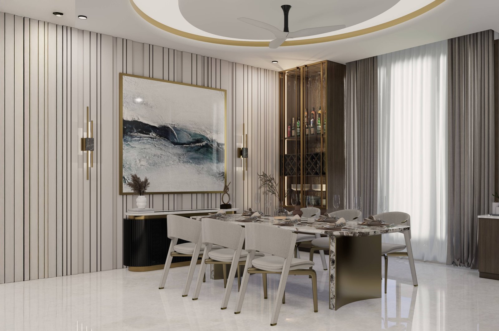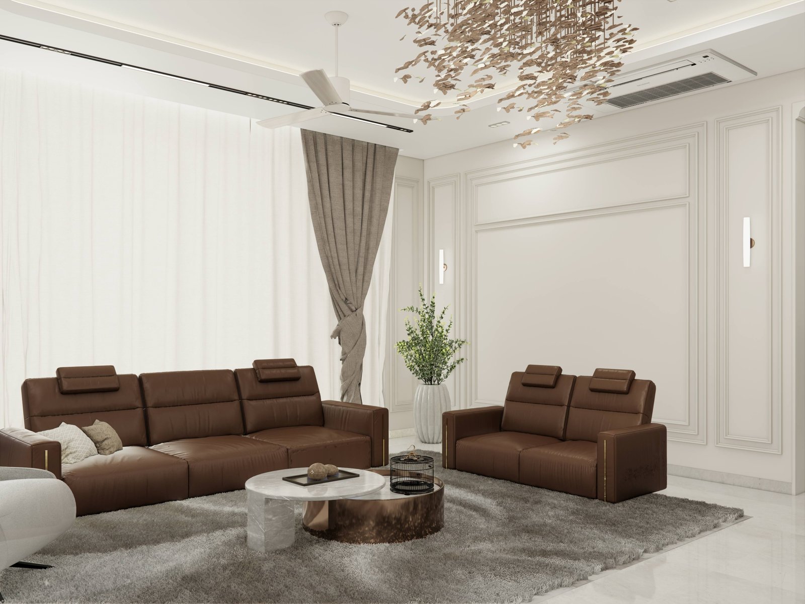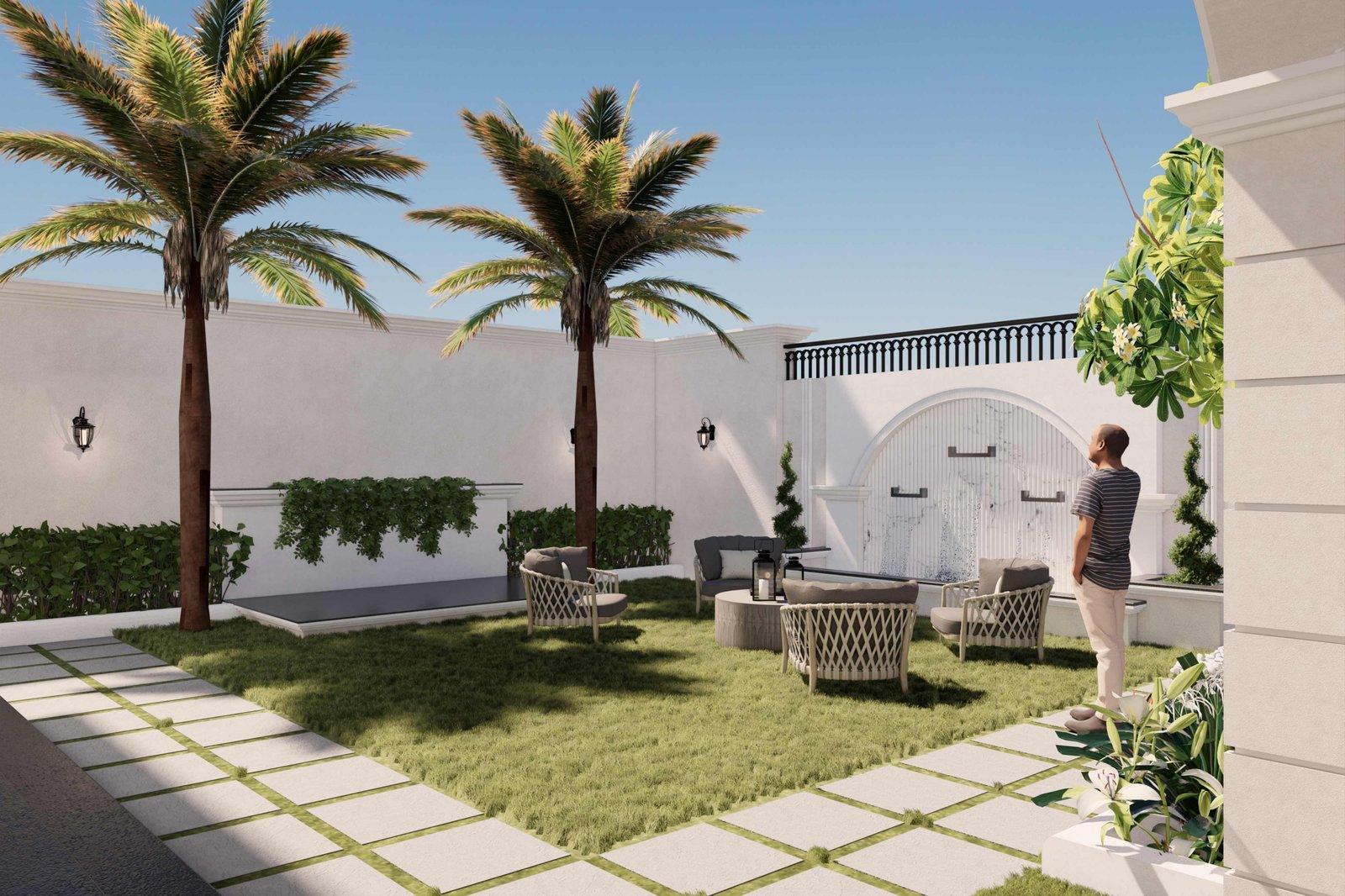 Generous colonnaded sit-outs and balconies form layered outdoor living spaces, allowing the residence to remain breathable and continuously connected to sea breezes, natural light, and the surrounding landscape. Soft, neutral façades provide a serene canvas, complemented by classic railings, arched openings, and textured finishes that add depth and understated elegance.