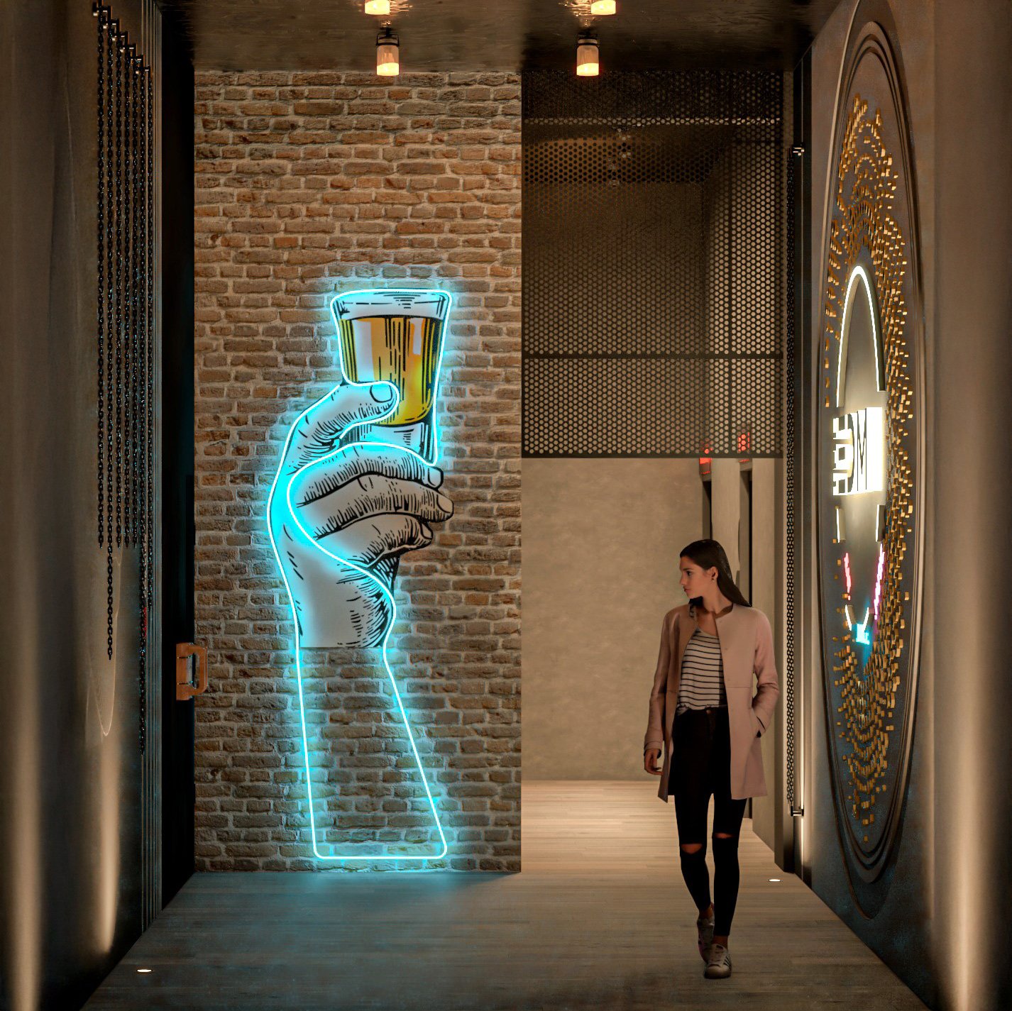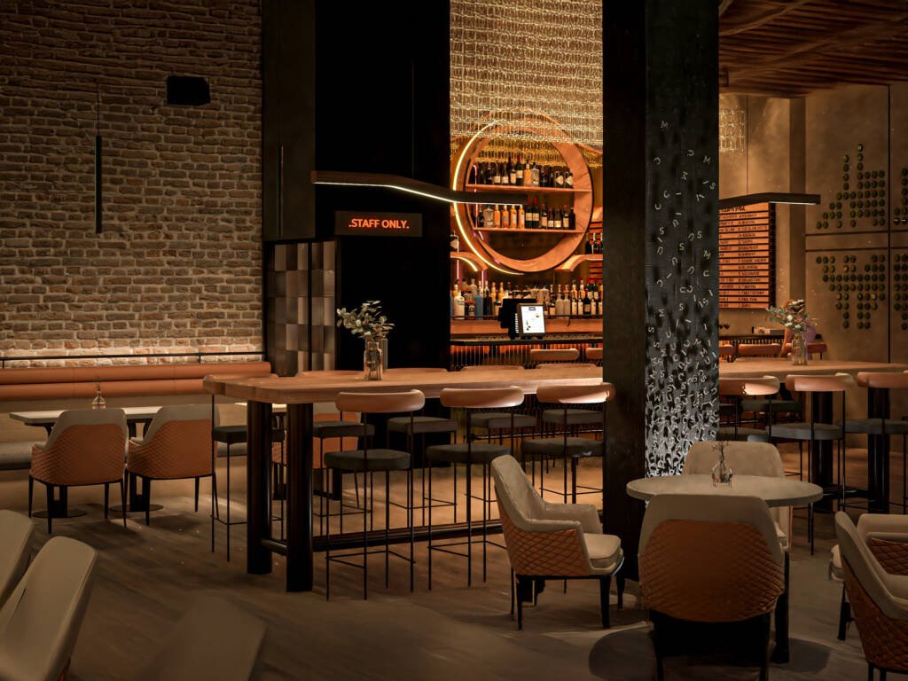 Exposed brick walls, muted concrete finishes, and dark metal accents form a robust backdrop, grounding the space with a sense of permanence. Against this, warm wood tones, upholstered seating, and ambient lighting introduce comfort and intimacy. The planning carefully balances openness and enclosure inviting guests to gather while still offering moments of privacy.