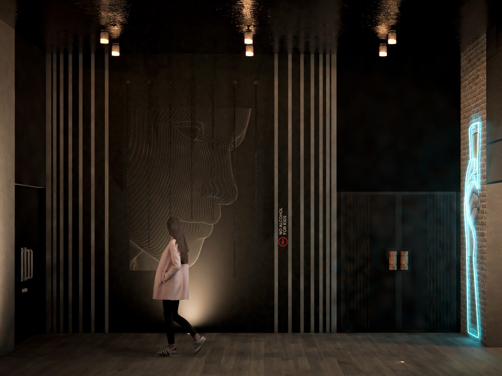 A large central screen anchors the social core, turning the bar into a shared experience during live sports and events, while neon art installations and curated graphics inject character and playfulness. The bar itself becomes a visual highlight layered shelves of bottles framed by glowing arches and textured surfaces, designed to draw attention without overwhelming the space.