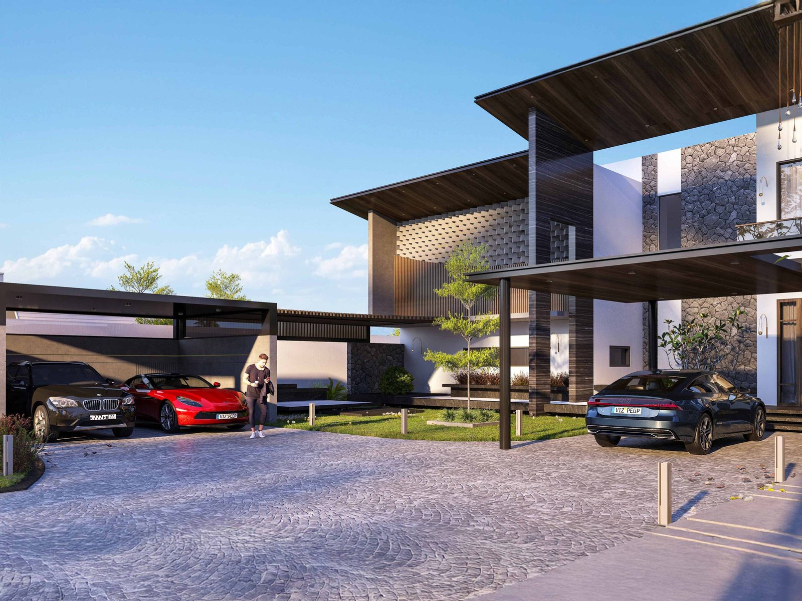 KMB Haus is conceived as a modern residence where formal clarity is enriched through thoughtful material expression. The architecture is articulated through strong rectilinear volumes and pronounced horizontal roof planes, establishing a composed yet visually commanding presence. Generous overhangs and cantilevered forms create shaded outdoor areas.
