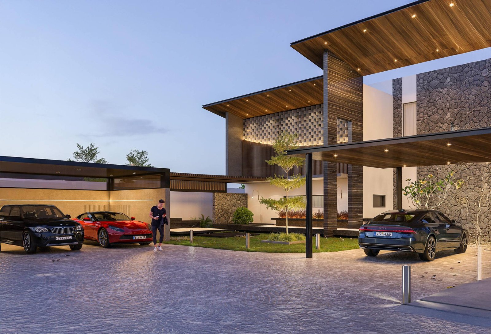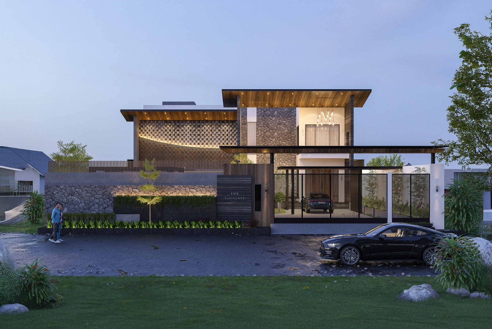 Materiality is integral to the identity of KMB Haus. Natural stone surfaces anchor the structure with a sense of solidity and permanence, while warm-toned soffits add texture, rhythm, and a layer of visual warmth.