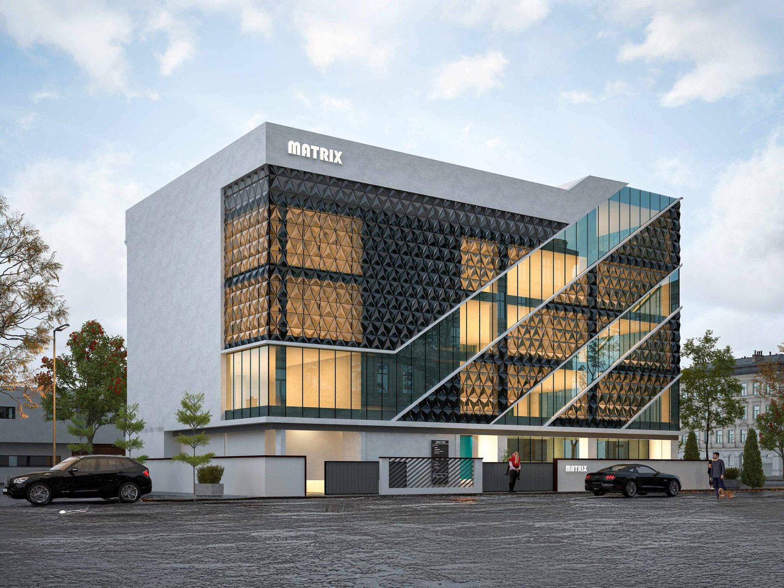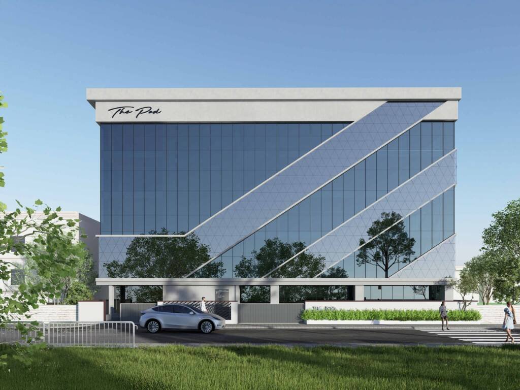 THE POD is a contemporary commercial project located in Coimbatore, Tamil Nadu, spread across a 23,000 sq.ft site. The design is defined by bold geometric forms and sharp diagonal lines that create a strong visual identity and iconic street presence.