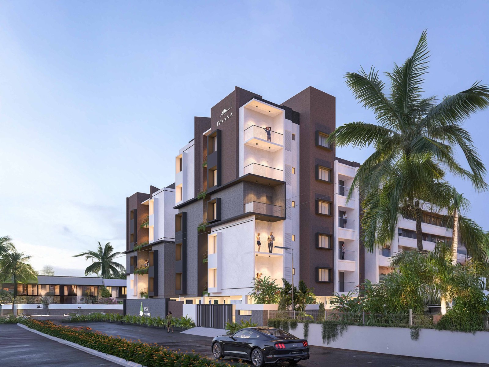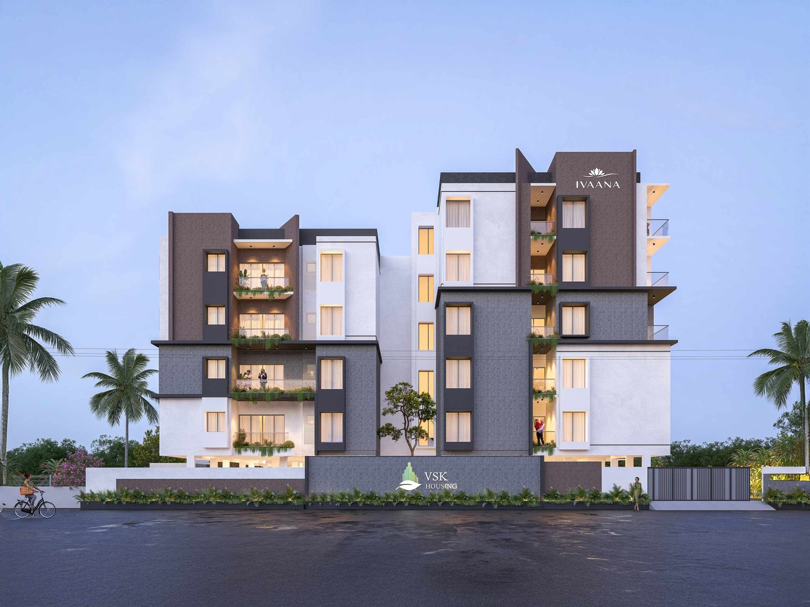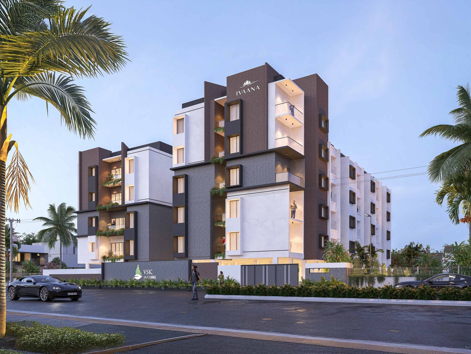 VSK – IVAANA is envisioned as a contemporary residential expression defined by balanced massing and refined material articulation. The façade composition juxtaposes textured cladding panels with smooth plastered surfaces, creating depth and visual rhythm. Vertical and horizontal planes are strategically offset to break scale and enhance elevation dynamics.